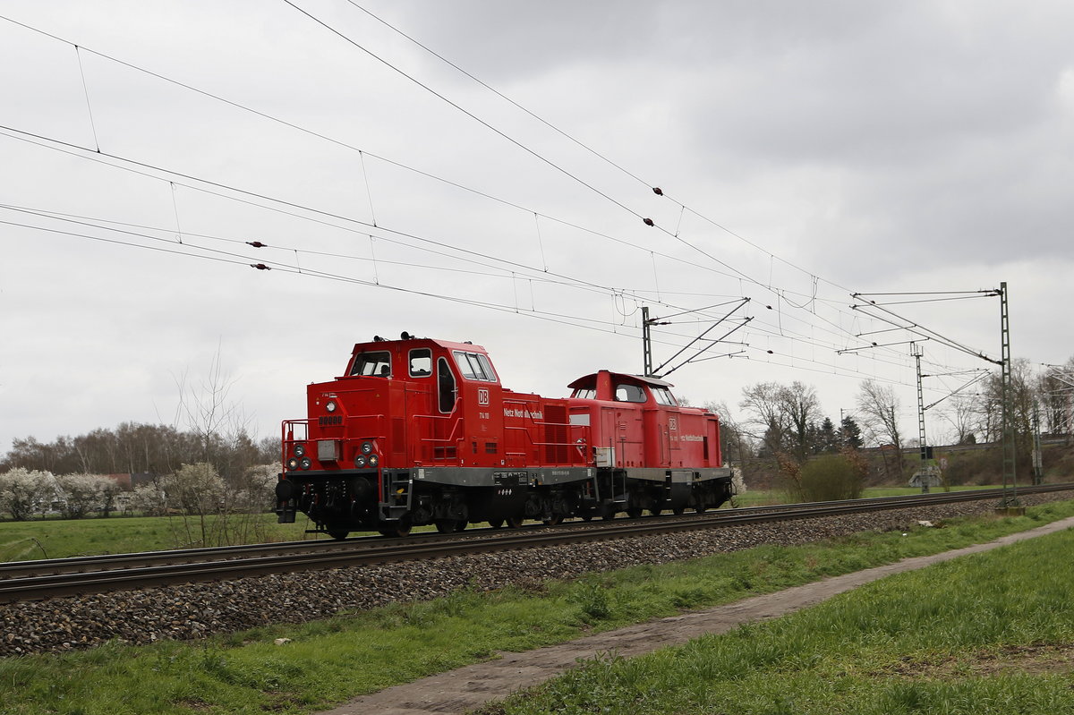 212 306 der "Bahnbau-Gruppe" war am 6. April 2021 mit drei Schüttgutwagen bei Übersee am Chiemsee in Richtung Freilassing unterwegs.