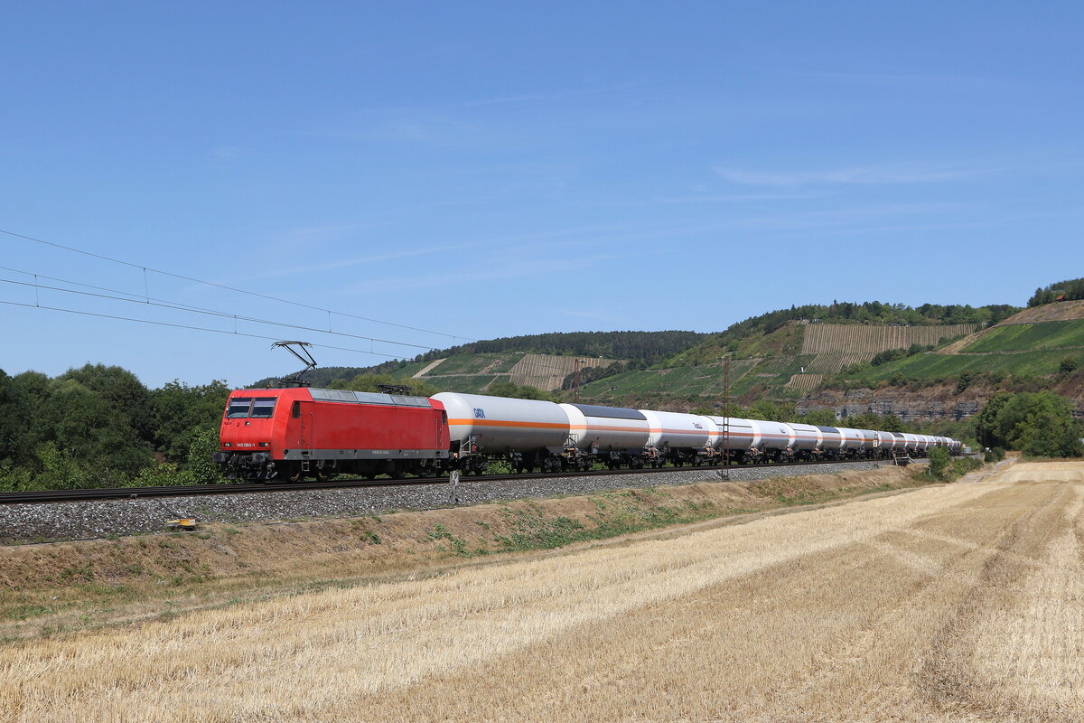 145 084-0 von "Rhein Cargo" mit einem Kesselwagenzug am 2. September 2016 bei Hamburg-Moorburg.