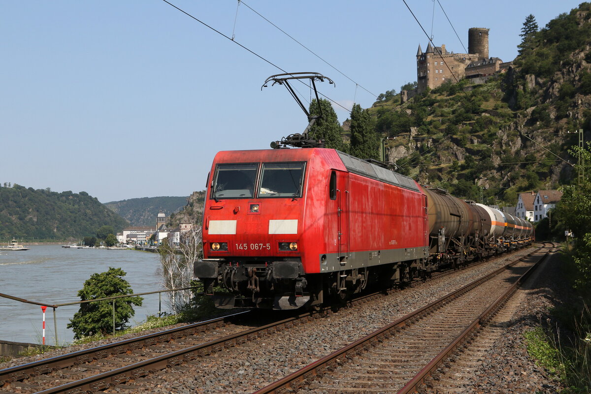 145 024 mit einem gemischten Güterzug am 7. August 2022 bei Harrbach im Maintal.