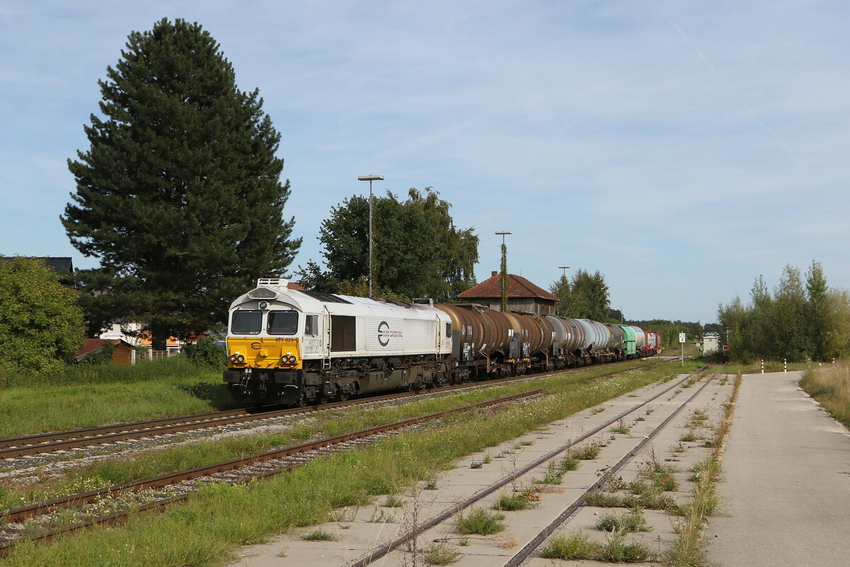 247 059-9 durchfährt mit einem Kesselwagenzug aus Burghausen kommend am 26. August 2015 den Bahnhof von Pirach.