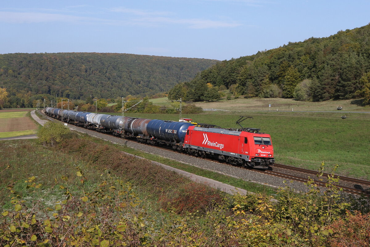 187 079 von "Rhein Cargo" mit einem Kesselwagenzug am 5. August 2022 bei Himmelstadt am Main.