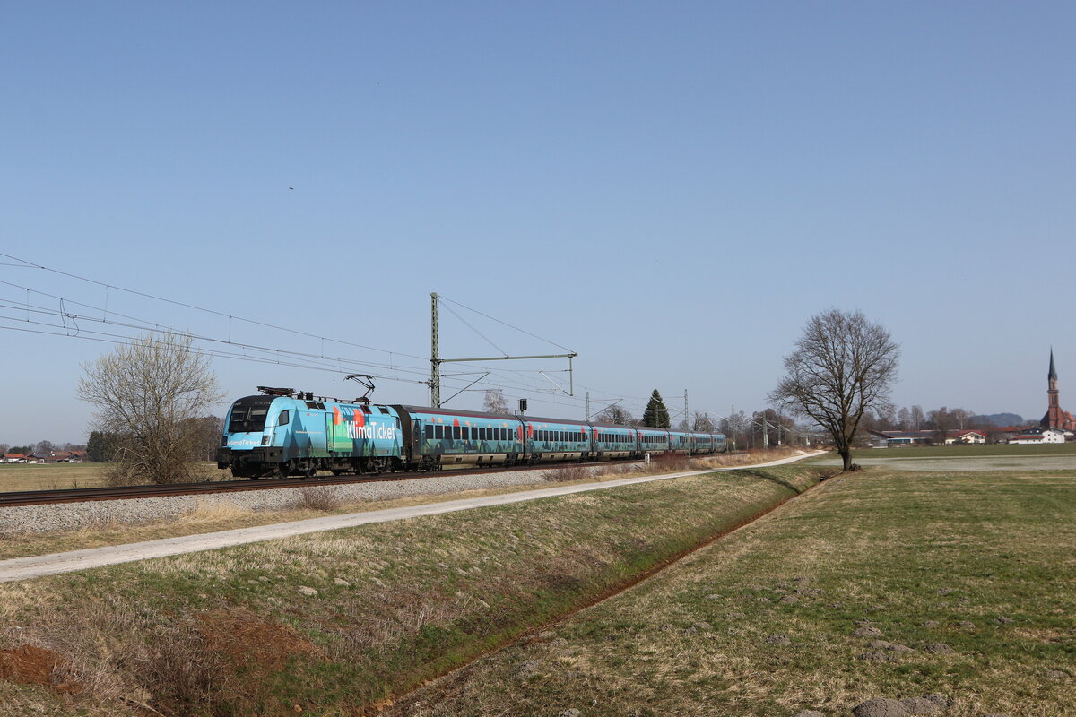 1116 244 mit dem "KLIMA-TICKET-RAILJET" aus Salzburg kommend am 7. März 2026 bei Übersee am Chiemsee.