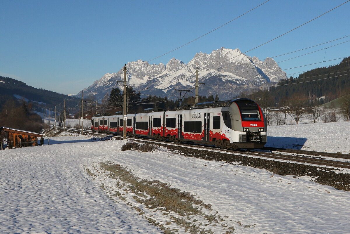4748 038 war am 3. Dezember 2025 bei Hochfilzen in Richtung Saalfelden unterwegs.